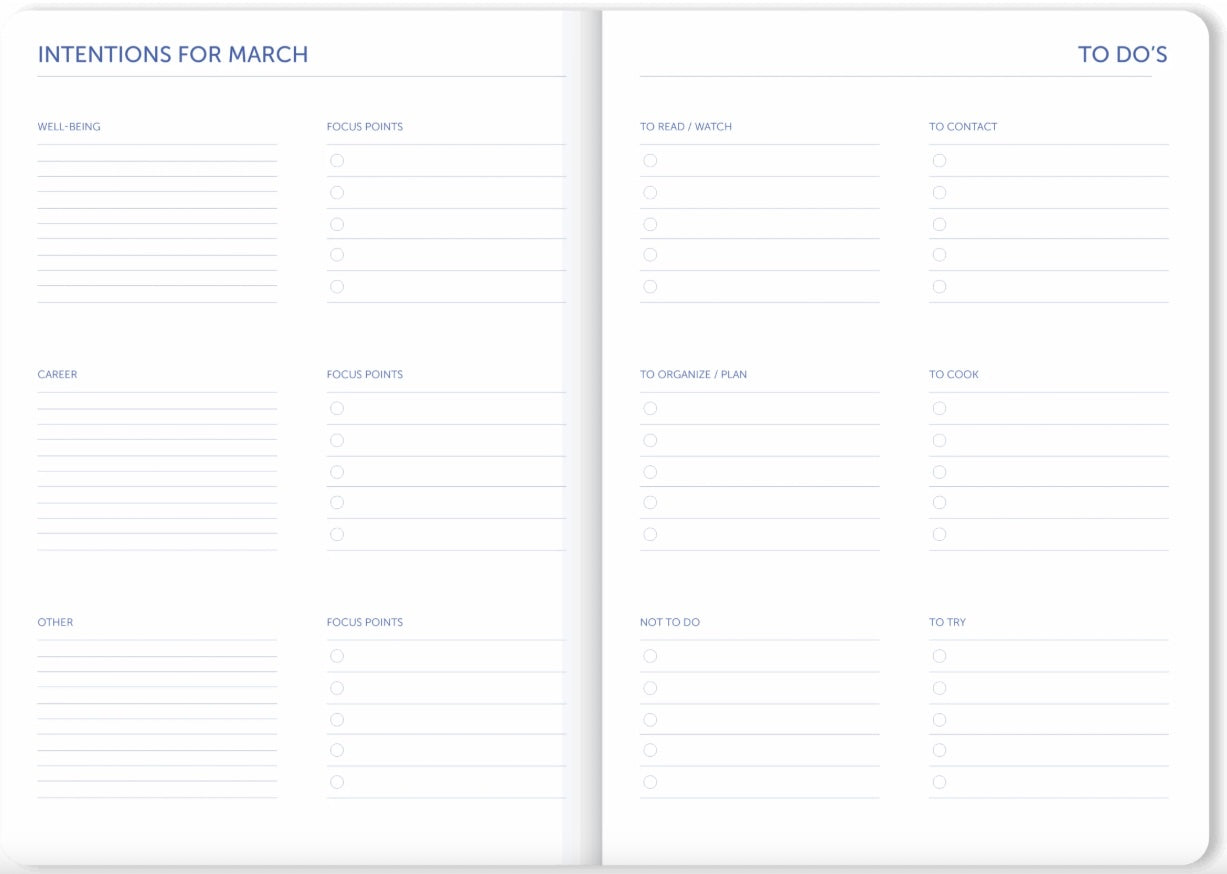 Neben der funktionalen Planung bietet er Raum zur Reflexion: Themen wie Wohlbefinden, Verbindung und Balance begleiten durch die Monate. Die offene Rückenbindung und das schlichte Design machen ihn zu einem besonderen Stück – elegant, reduziert und langlebig.