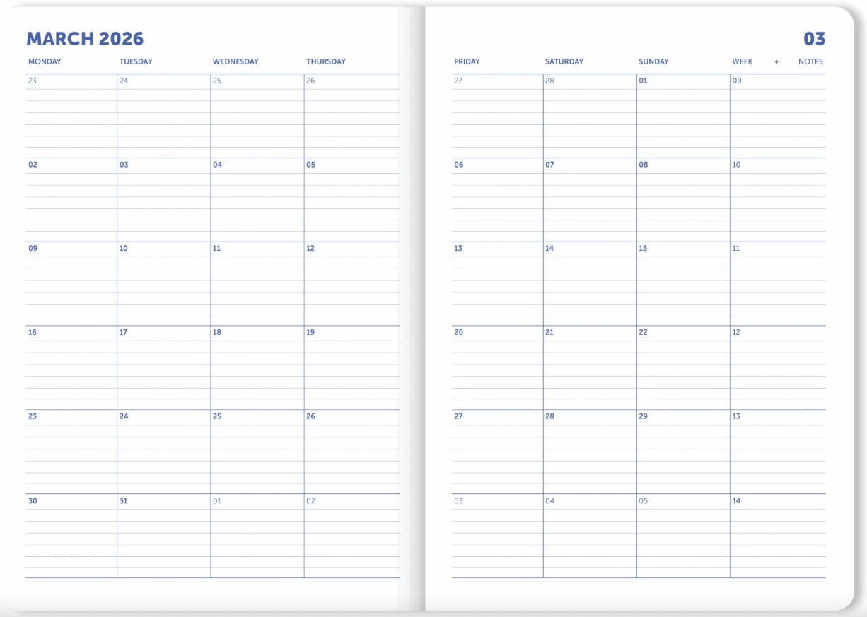 Der A-Journal Monatskalender bringt Übersicht und Ruhe in den Alltag. Mit seiner klaren Monatsstruktur und feinen Gestaltung eignet er sich ideal, um Termine, Routinen und Gedanken festzuhalten – über zwei Jahre hinweg.