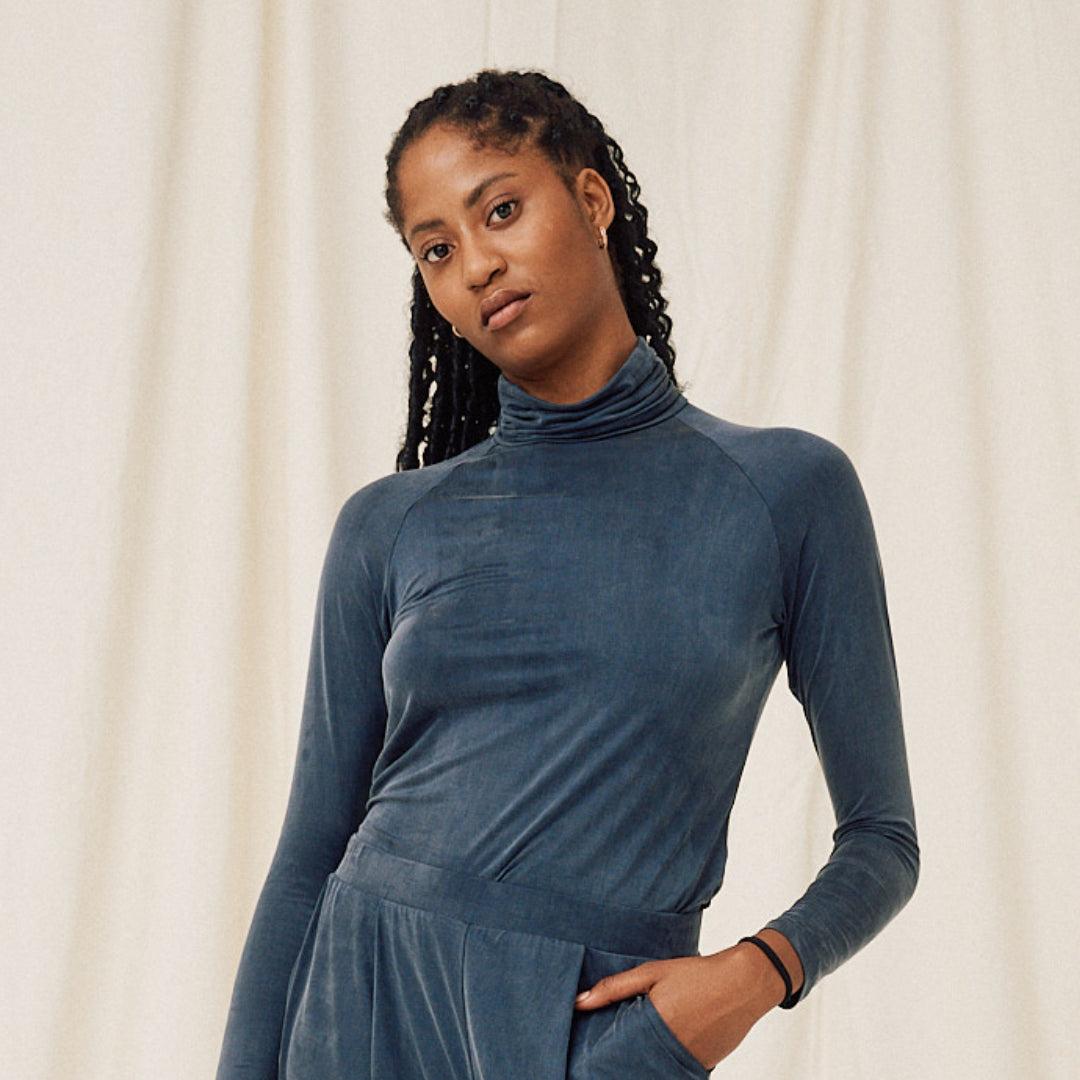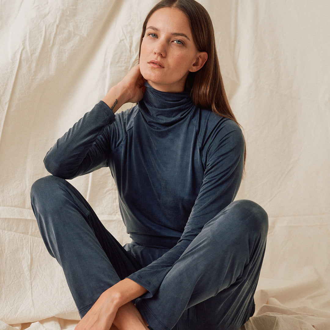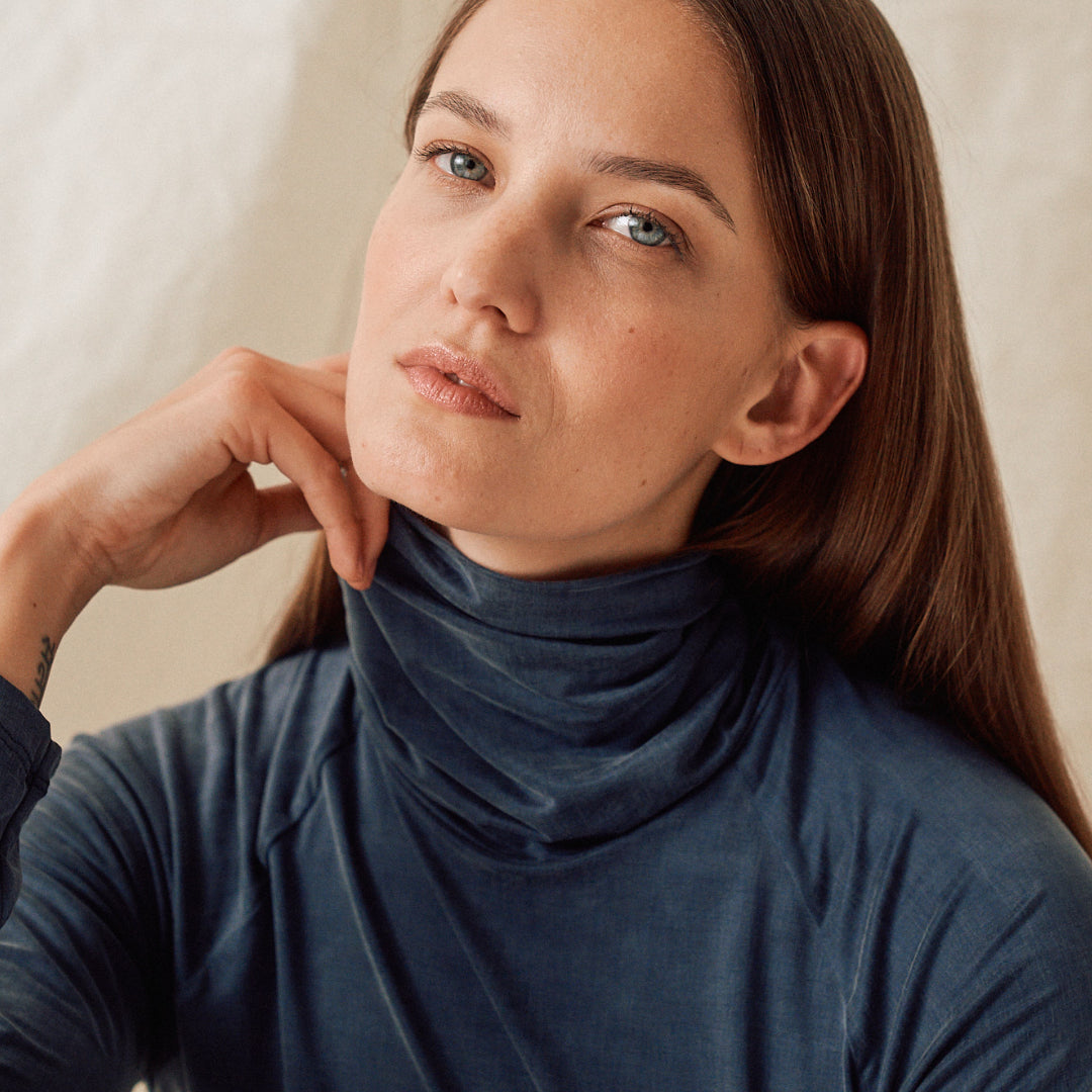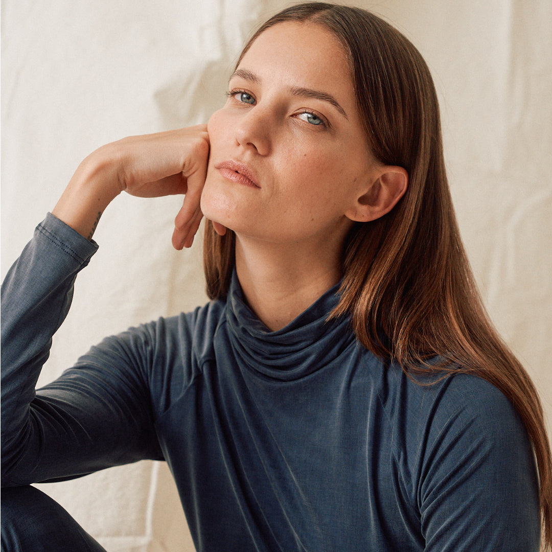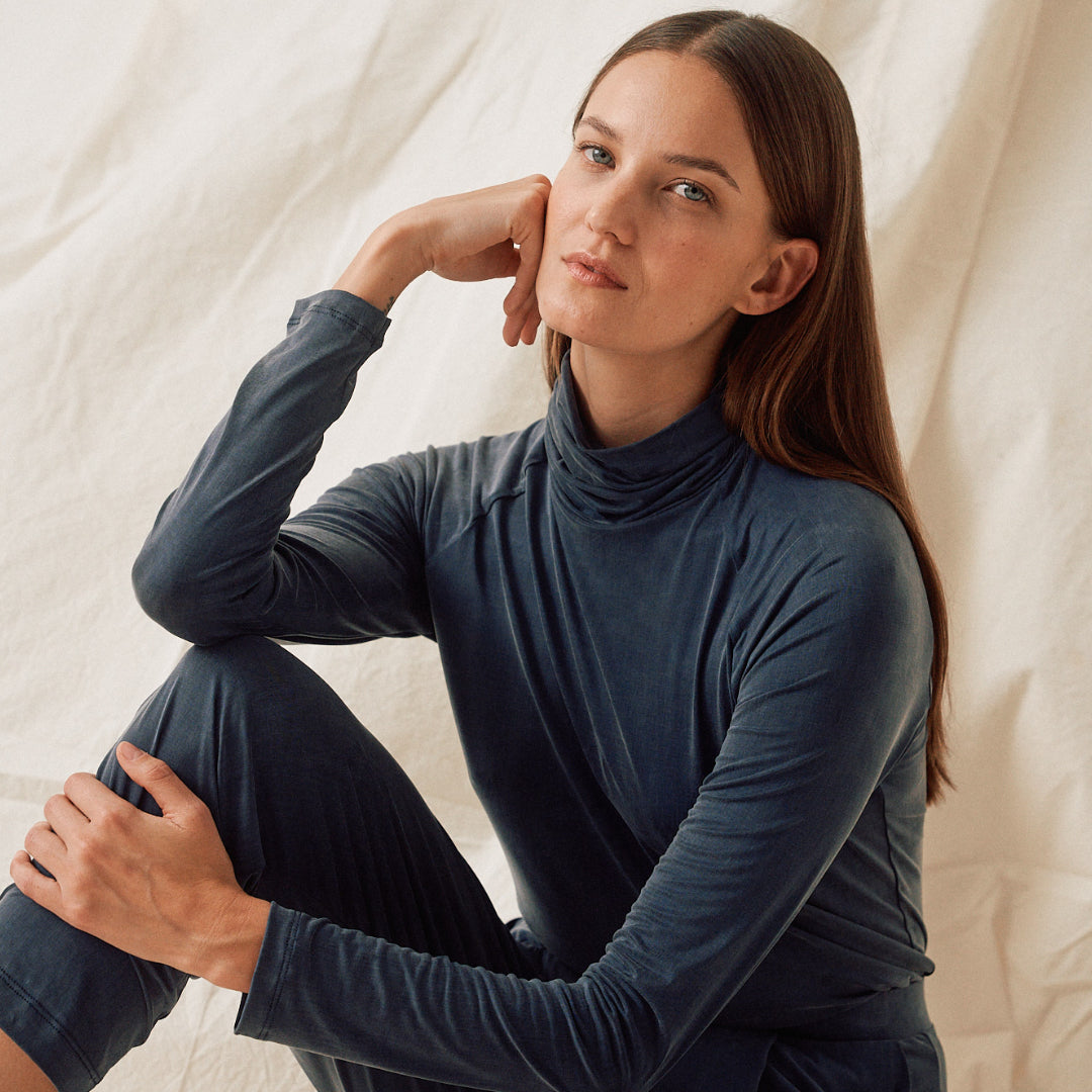 Der Cupro Rollkragen von Moya Kala ist zu Gast bei finally – eine nachhaltige Loungewear, die sich anfühlt wie eine zweite Haut. Der seidig weiche Cupro-Stoff schmiegt sich sanft an den Körper und vermittelt ein Gefühl von Ruhe und Leichtigkeit. Dieses moderne Rollkragen-Top ist ein Basic, der keinesfalls in deinem Kleiderschrank fehlen darf. Für sich getragen steht dieses neue Lieblingsstück für Understatement und unterstreicht deine individuelle Ausdruckskraft. Ideal funktioniert das Top in kälteren Tagen auch als Unterzieher unter Strick, denn kleine Fasern bleiben am Cupro-Stoff nicht hängen.