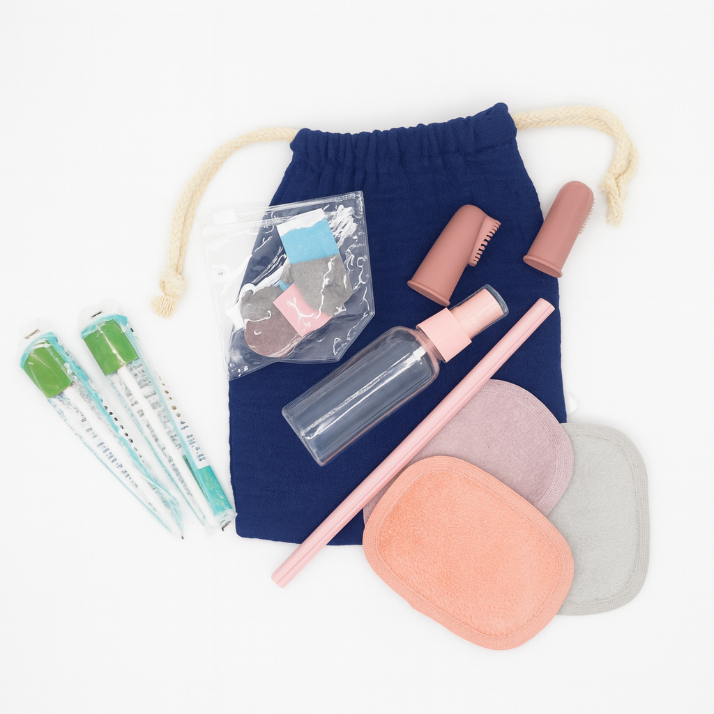 Inclus : des coussinets souples, des ustensiles de soins bucco-dentaires, une paille flexible et un sac en coton pour le rangement. Pour des moments de soins – calmes, doux et pratiques.