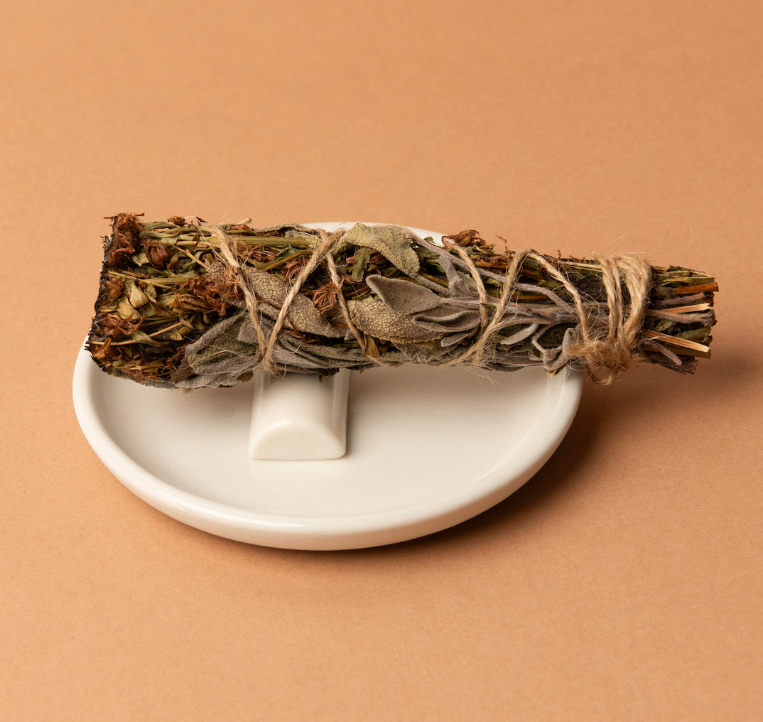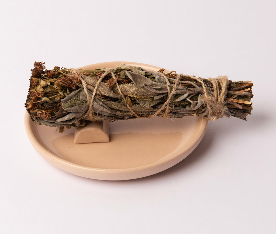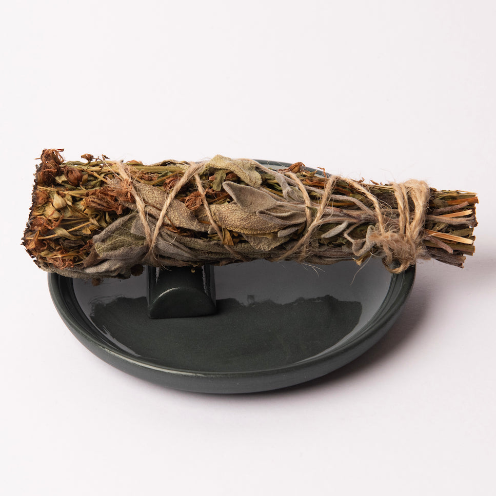 Der kleine Räucherteller mit seinem herausnehmbaren, eckigen Einsatz ist ein stilles Werkzeug für kleine Rituale: zum Räuchern von Kräuterbündeln oder Hölzern, beim Innehalten, Fürsorge, Loslassen. Während des Räucherns fängt er glimmende Pflanzenteile sicher auf – oder begleitet Dich als kleine Schale im Alltag.