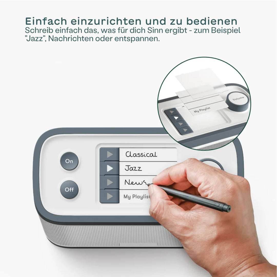 Die grossen, kontrastreichen Tasten sind leicht zu bedienen und ermöglichen es, drei Lieblingssender oder eine eigene Playlist mit nur einem Knopfdruck zu hören. Die Beschriftung der Tasten kann individuell angepasst werden – etwa mit „Jazz“, „Nachrichten“ oder „Entspannung“.