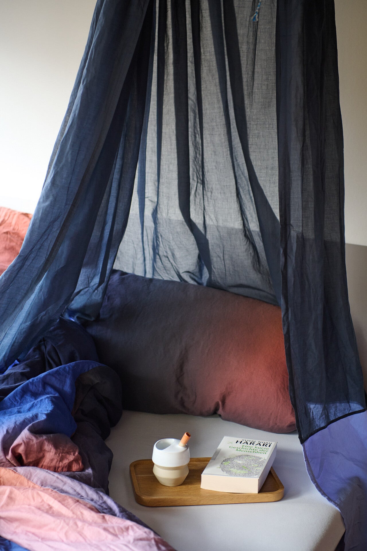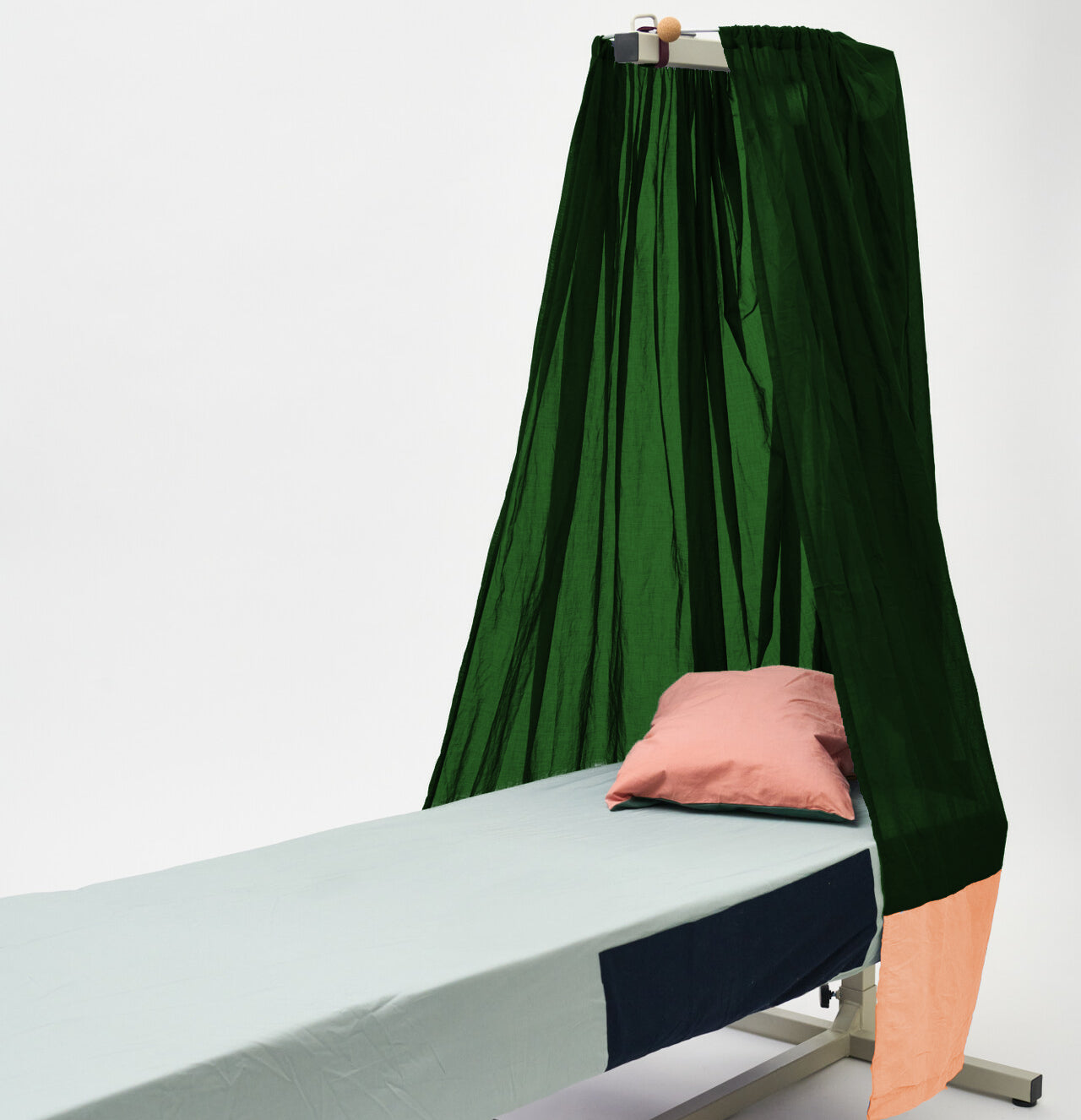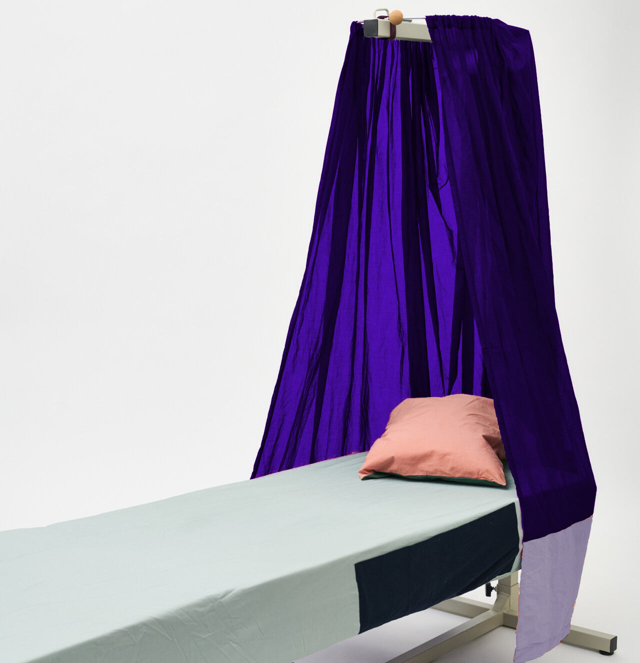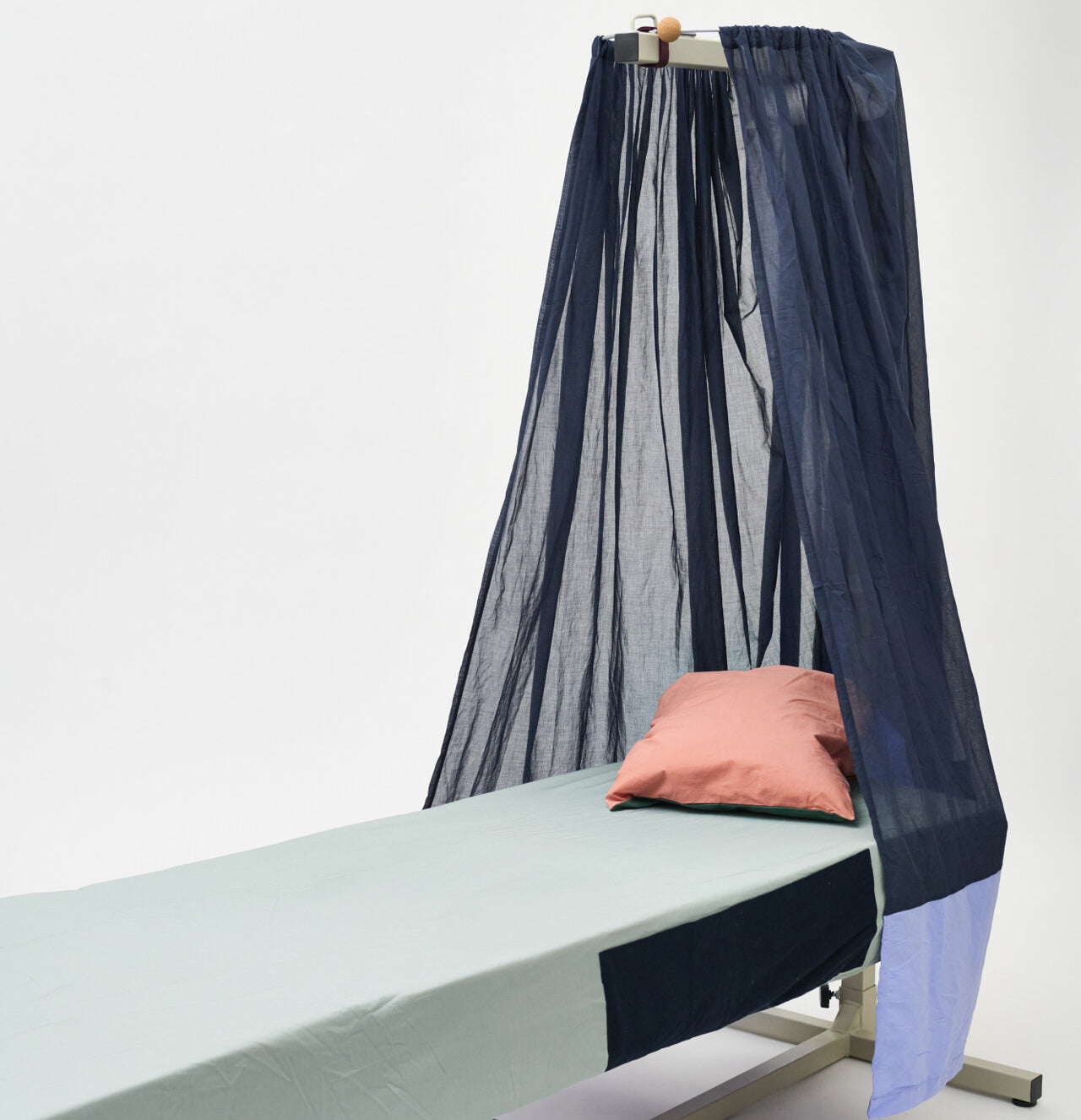 Gefertigt aus feinem, lichtdurchlässigem Baumwollstoff, verändert der Baldachin die Lichtstimmung sanft und schafft eine Atmosphäre von Geborgenheit und Heimeligkeit. Er kann ganz oder teilweise zugezogen werden. Äussere Taschen bieten Platz für Dinge, die in der Pflege schnell griffbereit sein sollen.