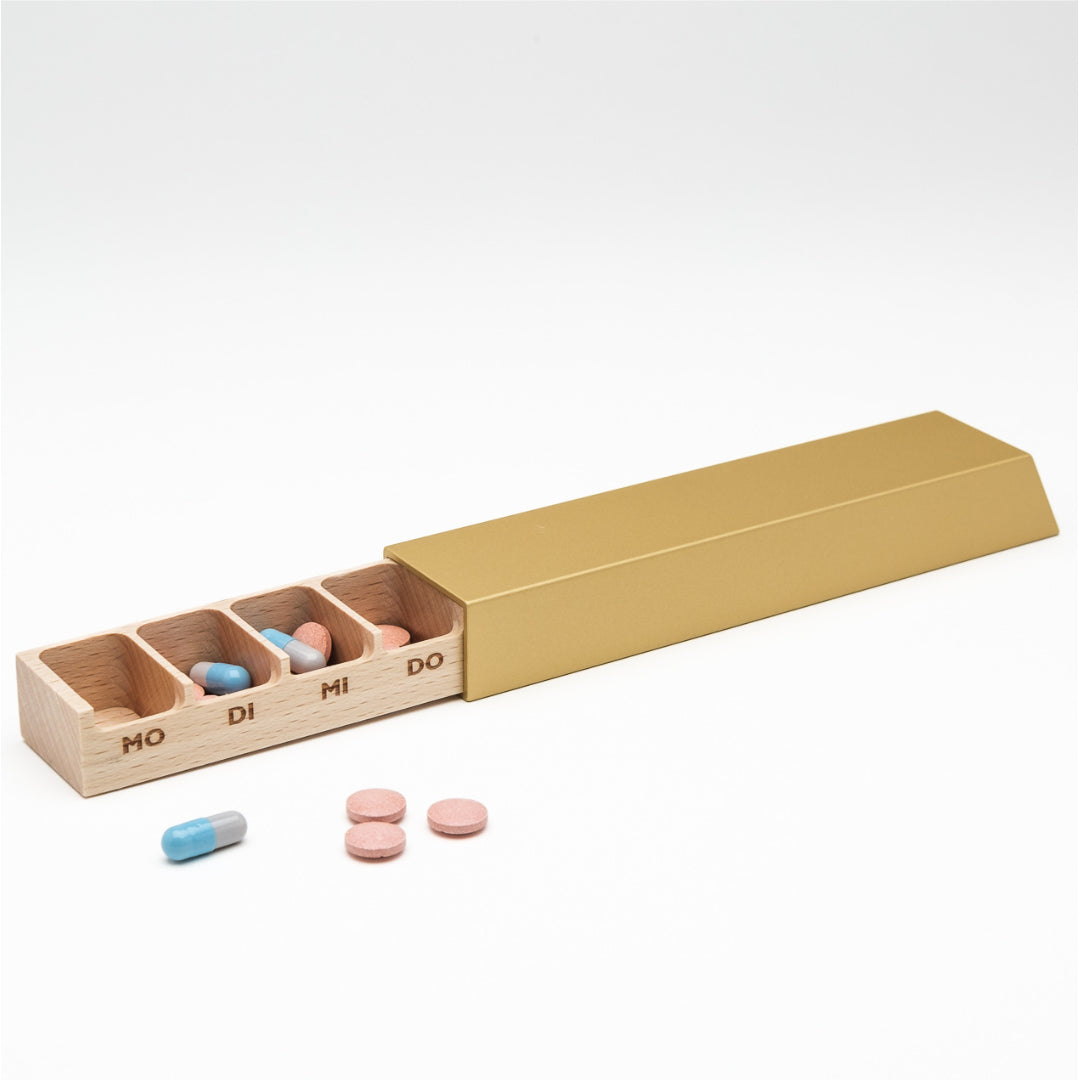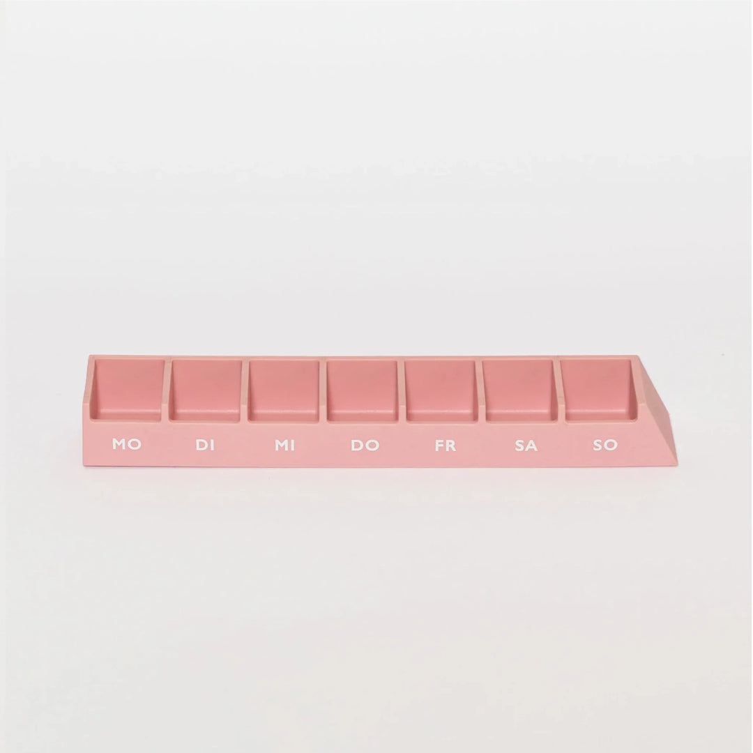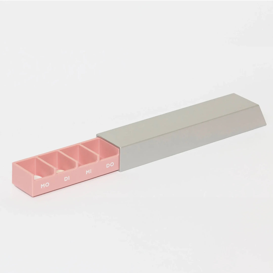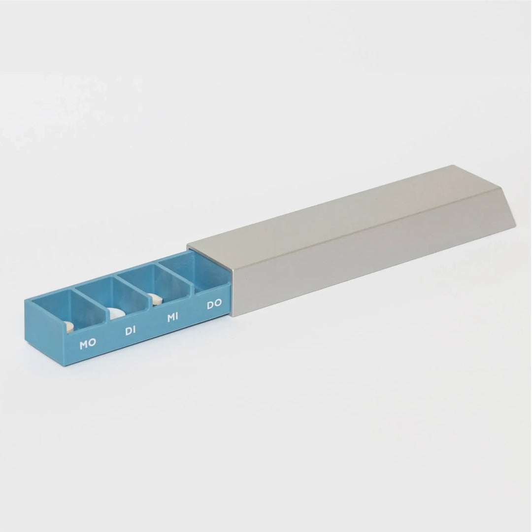 Die Monolith L Pillendose von Schoendiener verbindet Funktion, Design und Würde im Umgang mit Medikamenten. Sie bietet sieben grosszügige Fächer für eine Woche, öffnet und schliesst sanft dank Magnetverschluss und liegt angenehm in der Hand. Eine begleitende App erinnert an Einnahmezeiten und unterstützt den Alltag. Gefertigt in Deutschland, sorgfältig gestaltet für Menschen, die auf zuverlässige Ordnung angewiesen sind.